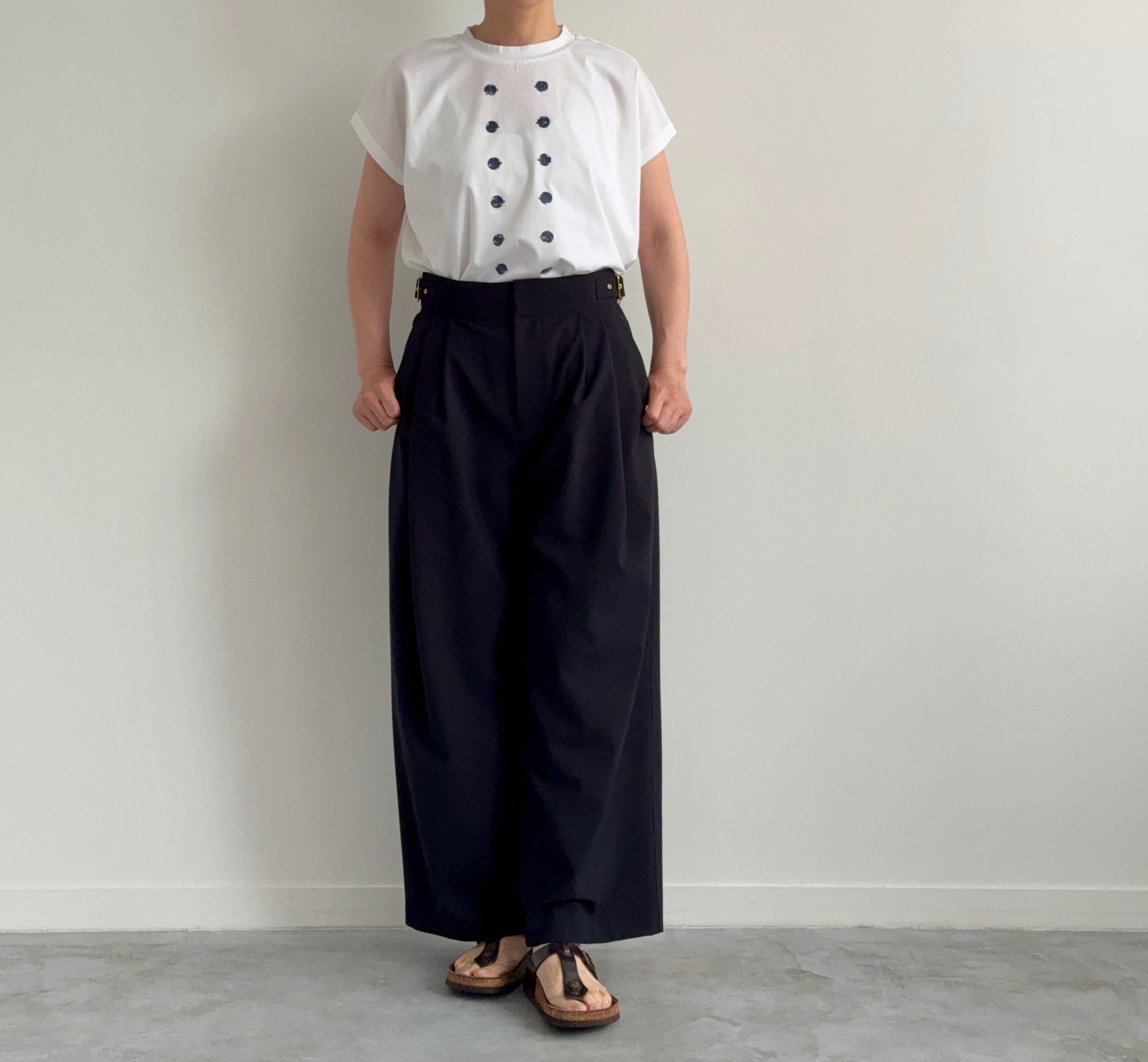 タック入りでウエストまわりが無理なくすっきりと見えるパンツ。