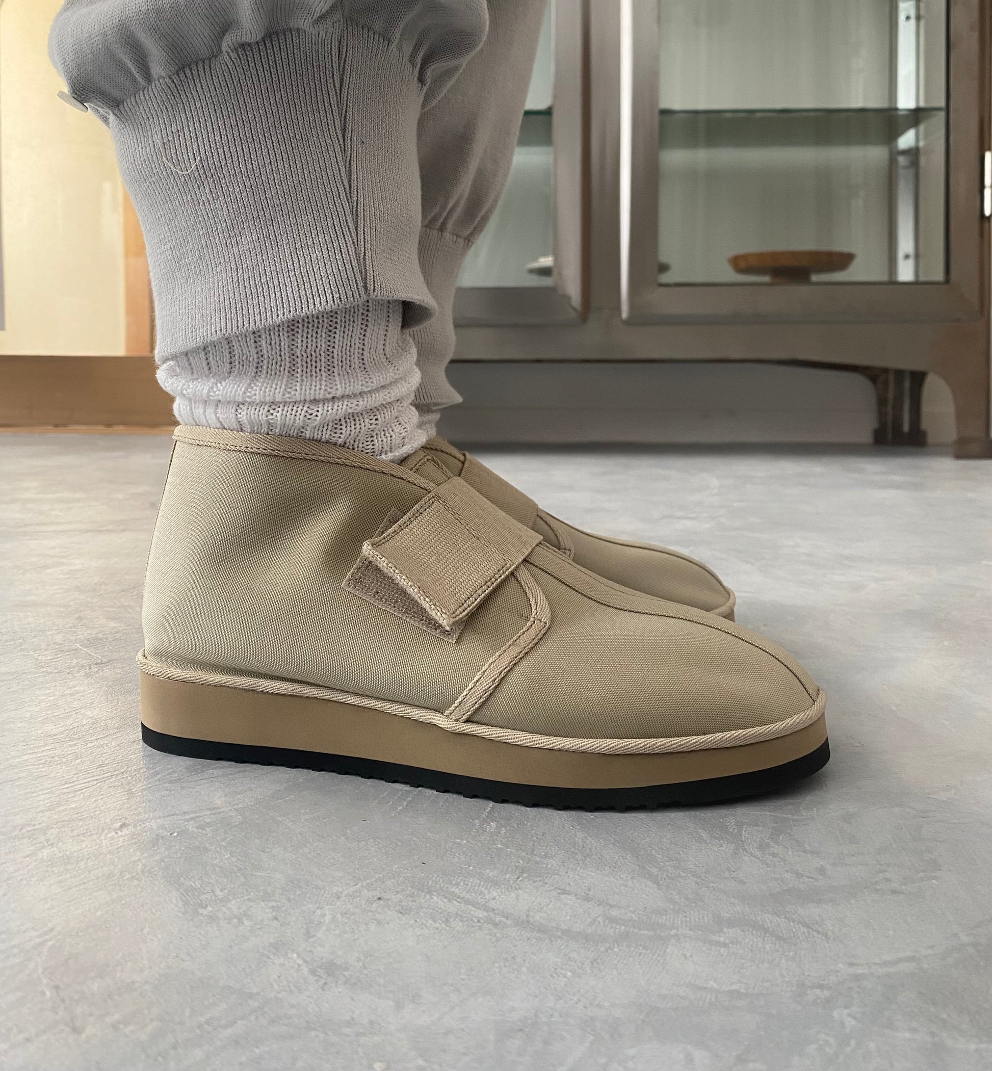 フランス軍の宿舎で履かれた簡易シューズをモチーフに作られたBELT SHOES。まるでルームシューズのように、とてもとても軽いんです。