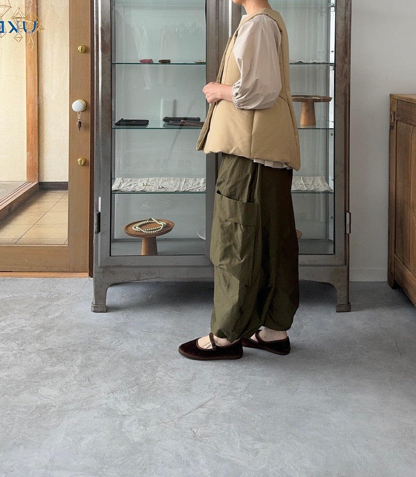 こちらはコルセットのようなシルエットのベストと、サイドのギャザーがアクセントになったワンピースのようなオールインワンの組み合わせ。