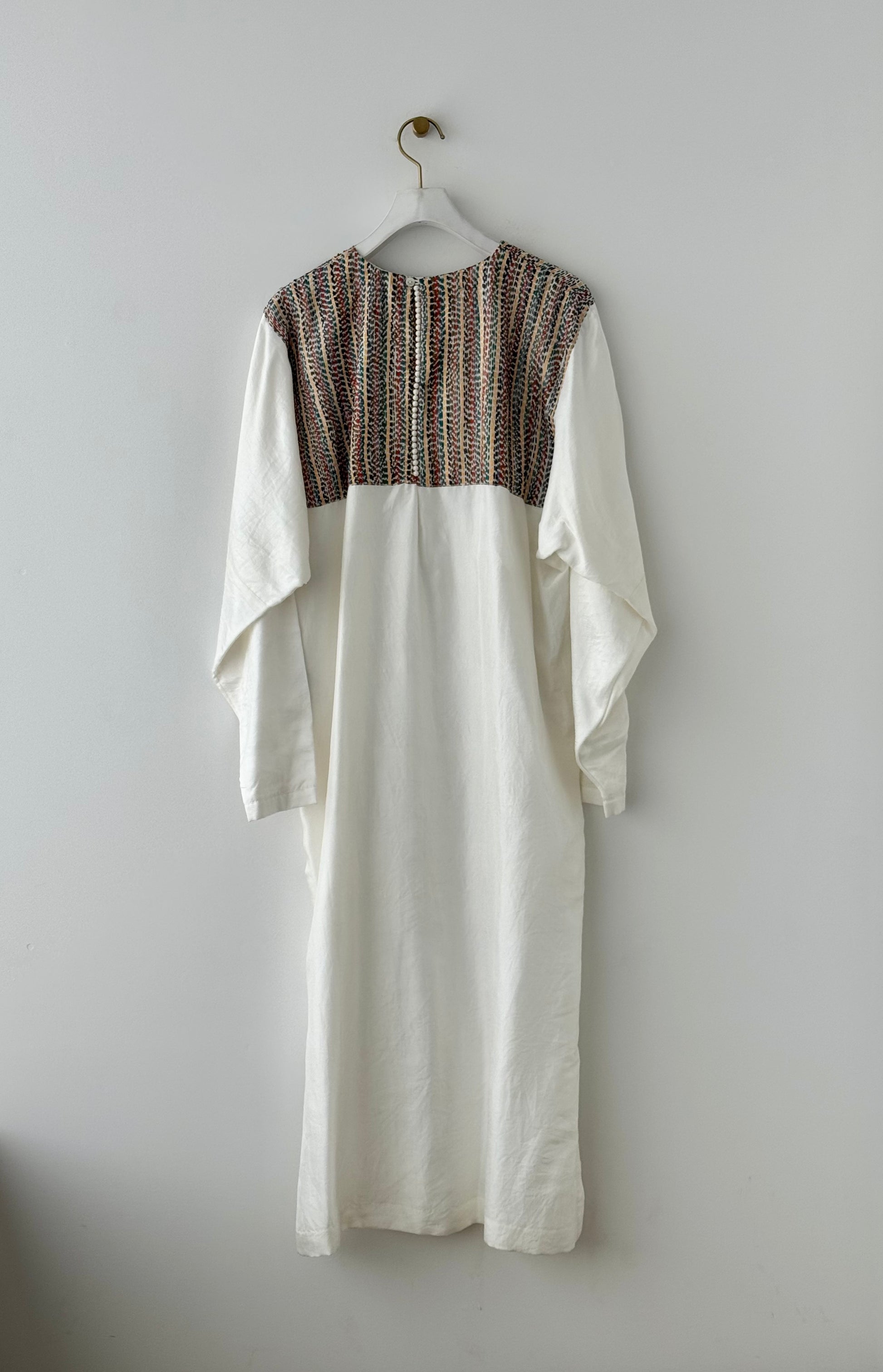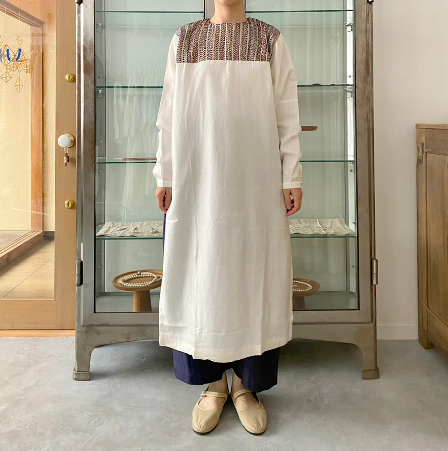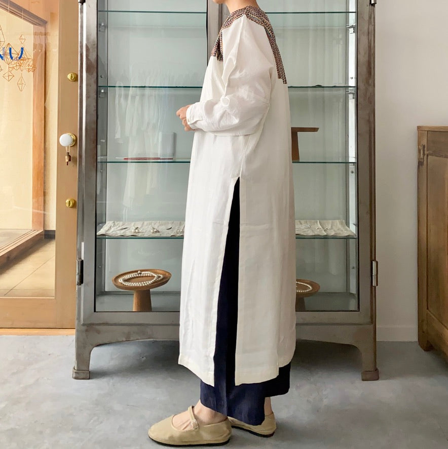 ドレスはシルクの光沢と色とりどりの糸も素敵ですが、スリットが深く入っているのでパンツやスカートとの重ね着も楽しみの1つです。