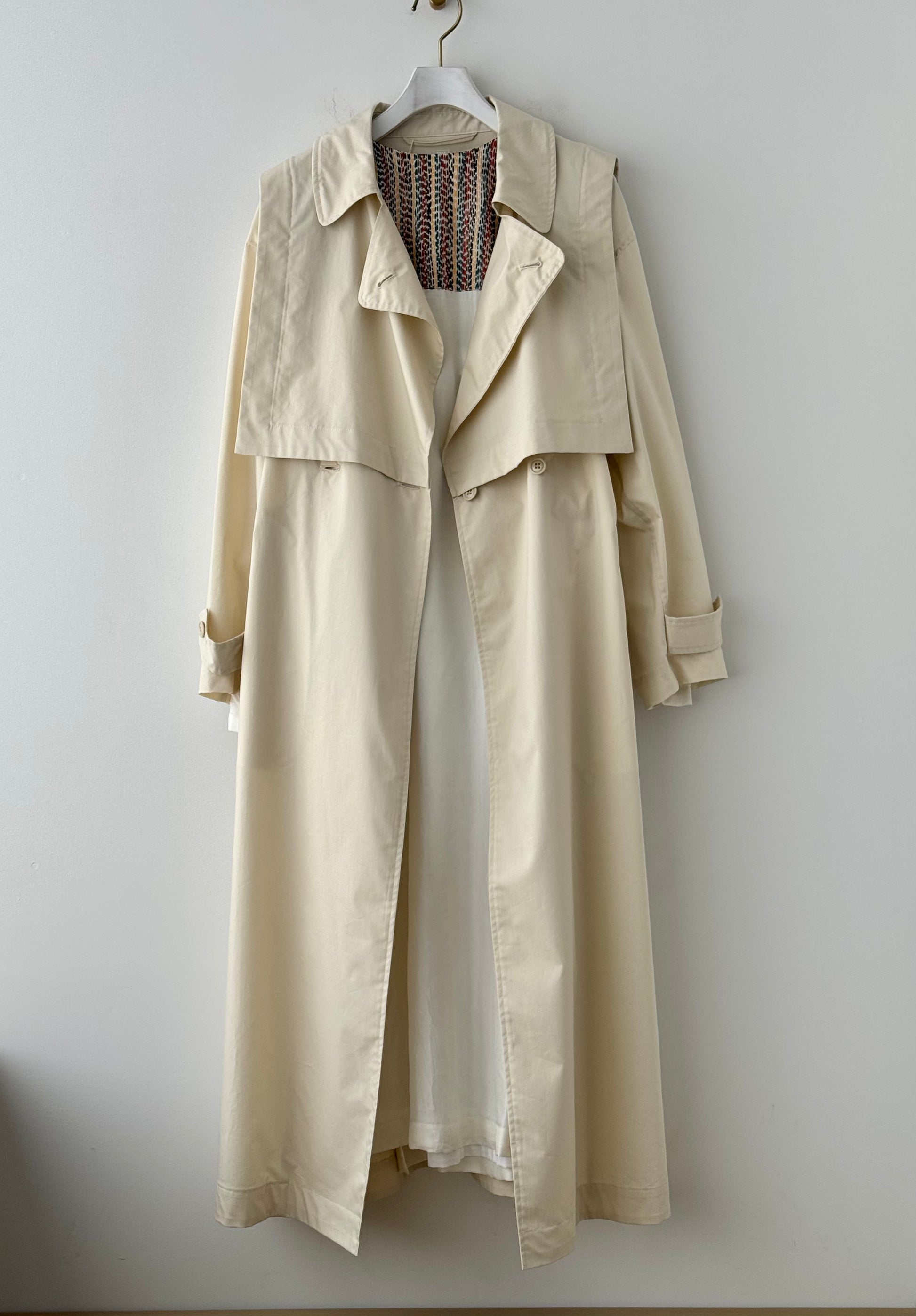 コートは襟を開けたり、全部閉じたり、ボタンを全部外しても、中に付いているテープを前のボタンに繋げると風が吹いてもコートがずれることなく着ることができます。