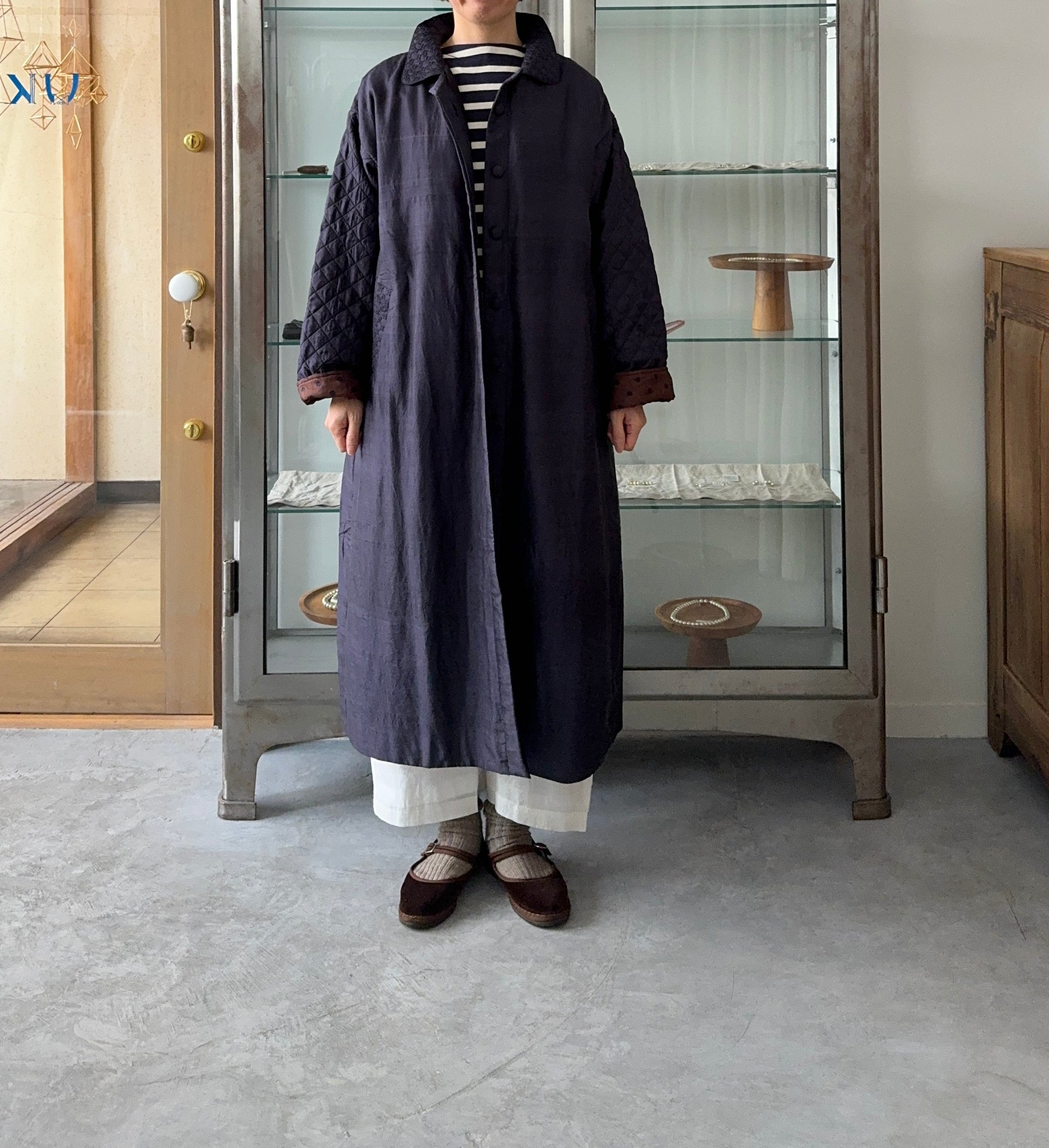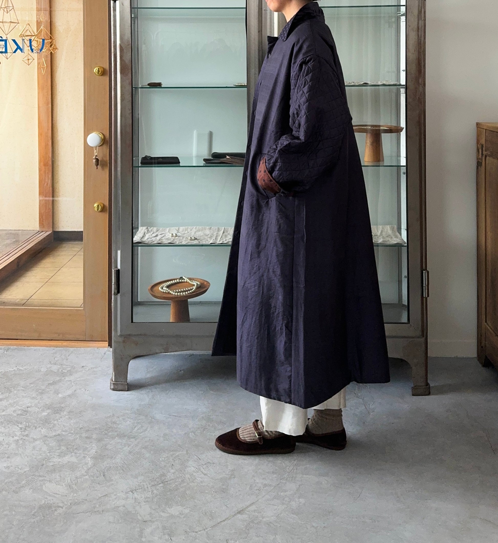 襟やポケットの入り口の細かな刺繍、三角に折れた襟元、袖口折り返すとドット、横から見たらふんわりとAライン...いくつもこだわりの詰められたシルクのコート。